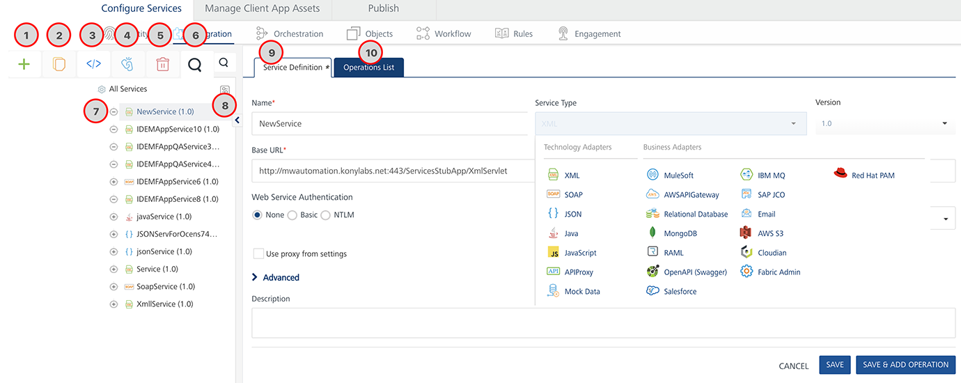 Number Section Description 1 Add Allows you to add the following:Add New ServiceUse ExistingAdd New Operation 2 Clone Allows you to duplicate an existing service. Changes made to a cloned service will not impact the original service. 3 Sample Code A dynamic code is generated based on the configuration of a service. You can use this code in your SDK. 4 Unlink Allows you remove the service from the Integration services section of an app. When a service is unlinked, it is disassociated from a particular app. 5 Delete button Allows you to delete a service. 6 Search button Allows you to search services and operations in the Services section. 7 Services section Configured services for an app.You can click the expand or collapse button of a service to show or hide operations in the services. 8 Show / Hide button Allows you the show or hide the tree. When you hide the tree section, the right pane is used for service definition or operations details. 9 Service Definition tab Allows you to configure service defection for an integration service. 10 Operations List tab Allows you to configure operations for an integration service. The Operations List tab appears only after you save the details in the service definition tab. -