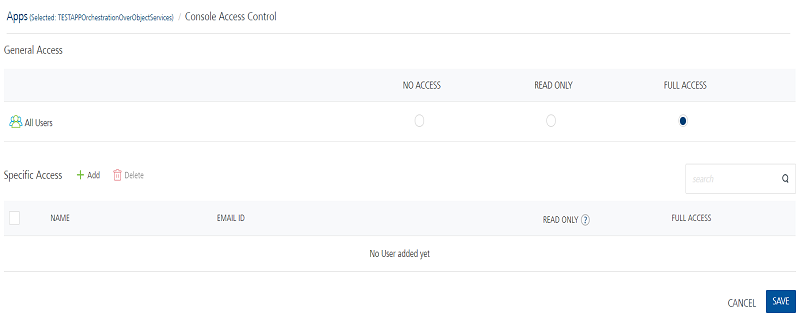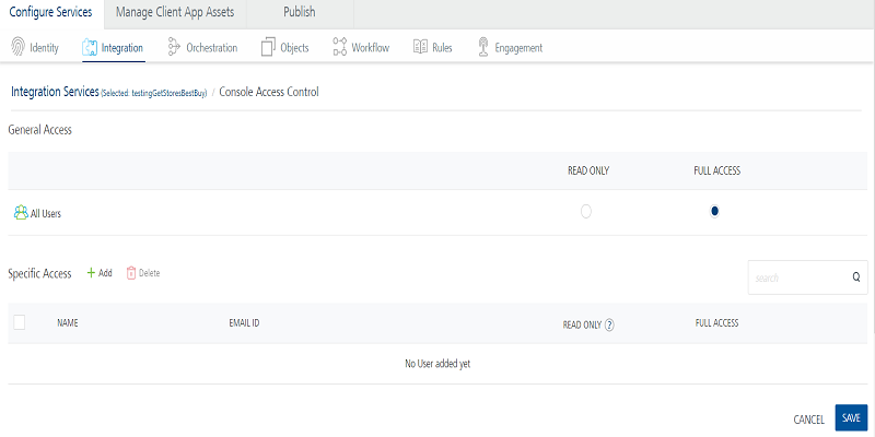 By default, all the services created have Full Access for all users. You can control access to identity services, integration services, orchestration services, and object services by setting the access control for the service. For example, UserA decides to give read-only access to all users for an integration service (General Access), and give full access to the service to UserB (Specific Access).