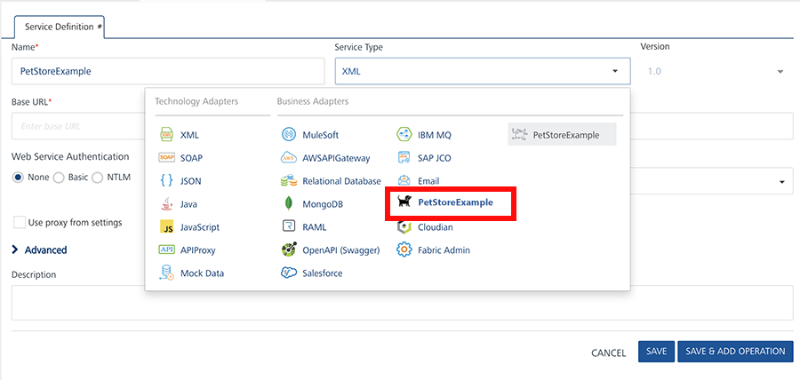 As we named our adapter PetStoreExample, click on PetStoreExample to use it in your service.