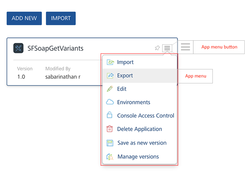 Note: You can also export an App via API. For more details, refer to Continuous Integration - Export an app via API