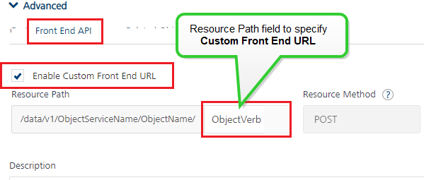 Note: By default, the Front End URL check box is not selected. And the URL path (populated with an operation name by default) in the Resource Path field is disabled from editing.
