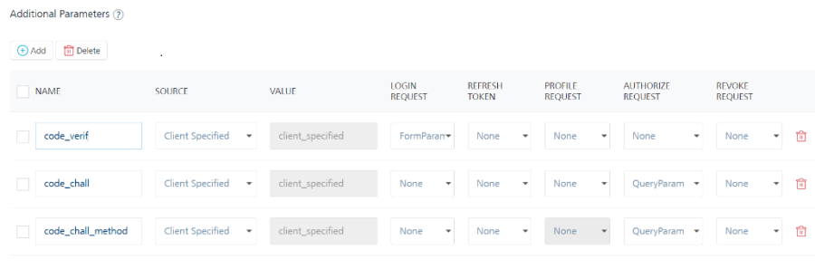 But, if the PKCE parameters from the back-end OAuth provider do not follow the rfc7636. naming convention, you need to configure the PKCE parameters in the Additional Parameters of the Advanced section. For more information, refer to the following image.