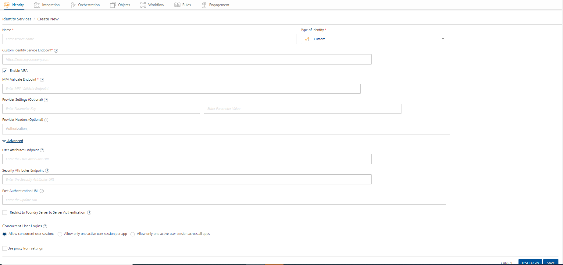 Enter a custom identity endpoint configured as an integration service. A custom endpoint URL (VoltMX Foundry's custom identity protocol) is available in the