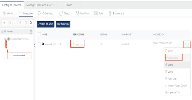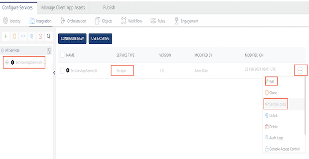 - When an app that contains a scraper service is migrated, then the Service Type field is filled in Scraper in the integration tab of Volt MX Foundry Console, shown below: