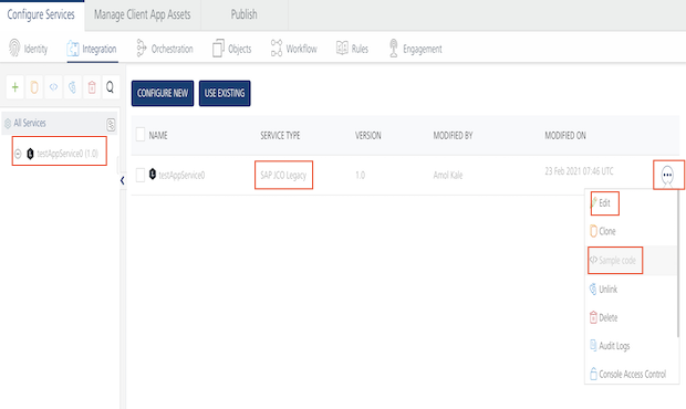 - You cannot edit SAP JCo services in the Volt MX Foundry Console. If you click the Settings cogwheel button for the service, the following app menu appears.