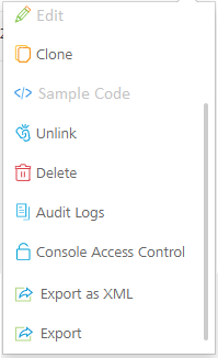 Clone, Unlink, Delete, Audit Logs, Console Access Control, Export as XML, and Export are supported. For details, refer to How to Use Actions on an Existing Integration Service.