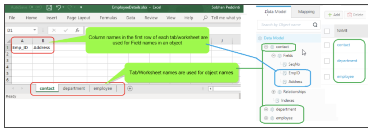 - Column names in the first row of each tab/worksheet are used for fields names in an object
