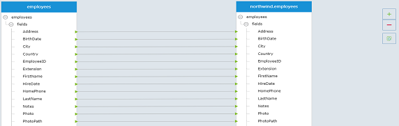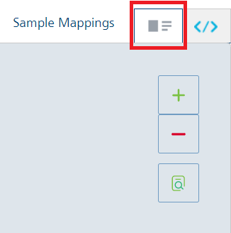 After you are in visual design view, you can increase and decrease the zoom level of the viewing pane by clicking the + and - buttons in the upper-right corner of the pane. In addition, you can hide mappings by clicking the button below the zoom buttons and selecting which type of mappings you want to hide.