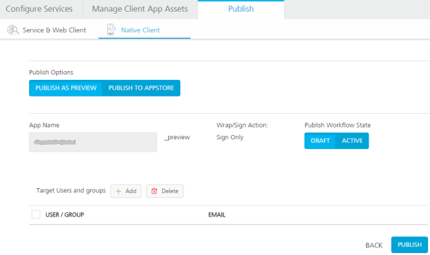 If Publish Workflow State is selected as DRAFT, Volt MX recommends that you target users or groups. It is an optional.