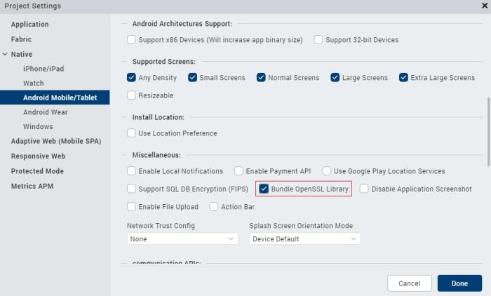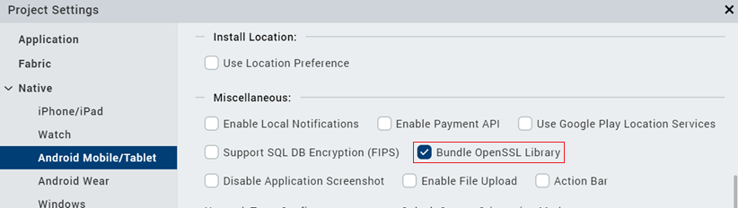 - In the Android platform, you must also enable the "Bundle OpenSSL Library" option in Project Settings. For information about this setting see Additional Settings.