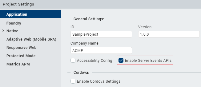 - On the Project Settings window, in the Application section, select Enable Server Events APIs.
