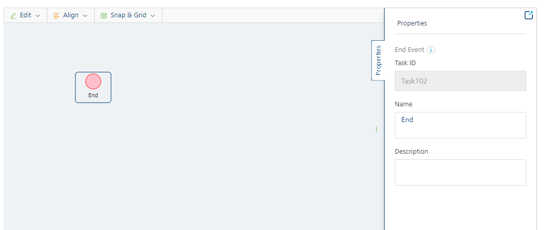 IMPORTANT: For Integration Service triggered workflow > Sync, the Response Output configuration is a mandatory, in the End node. Refer to End node for Integration Service workflow > Sync. IMPORTANT: End event that represents the end of an Async workflow. |