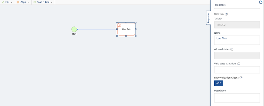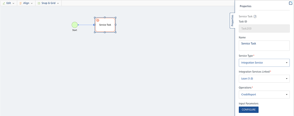 | Service Task – A Service task is used to invoke a pre-configured service (Integration, Orchestration, Object and Rules Services) available in the Foundry App. |