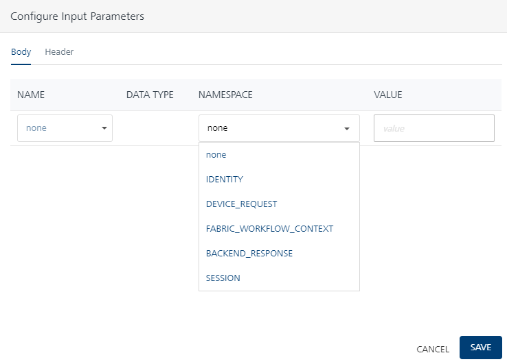 - Select the namespace from the list, and then add the related parameter in the Value field. For example, if you select BACKEND_RESPONSE from the namespace list, and add balance in the Value field, it would be read as BACKEND_RESPONSE.balance.
