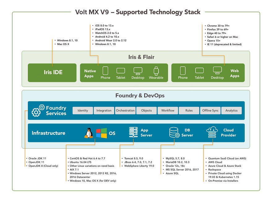 For development environment, a developer can preferably install Volt MX Foundry components in a standalone mode (single node) on a local environment. For more details, refer to Single Node Installation.