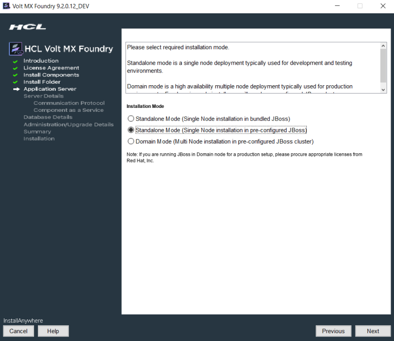 Important: To install Volt MX Foundry on single node on JBoss that is installed along with the Volt MX Foundry Installer, click Standalone Mode (Single Node installation in bundled JBoss). For more details, refer to Standalone Mode (Single Node in bundled JBoss) Installation.