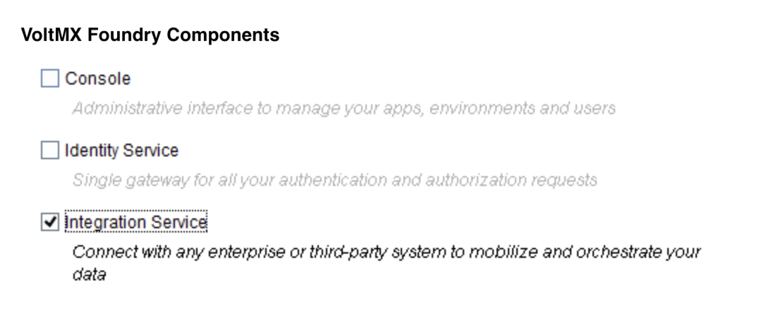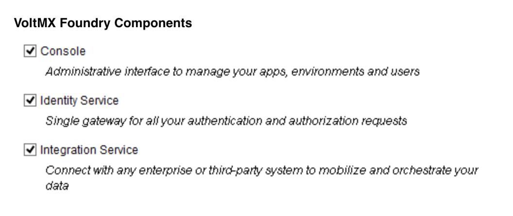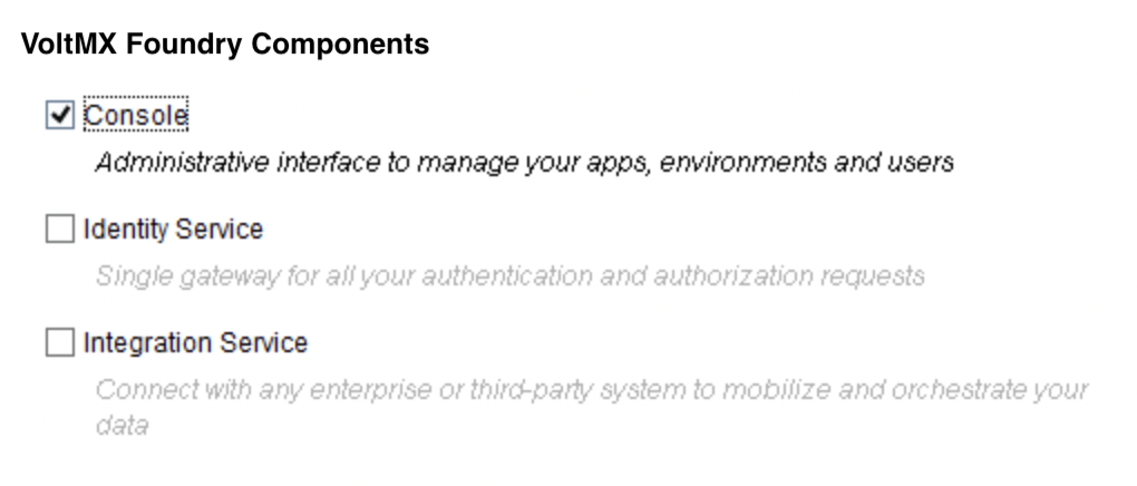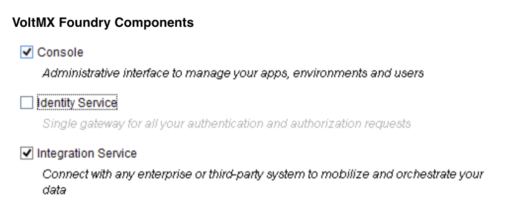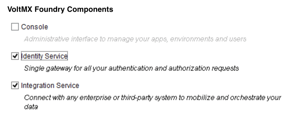 The system creates the following databases:<prefix>mfconsoledb<suffix>,<prefix>mfaccountsdb<suffix>, and<prefix>mfreportsdb<suffix>. - Identity Services - To install VoltMX Identity Services, select the Identity Services check box.