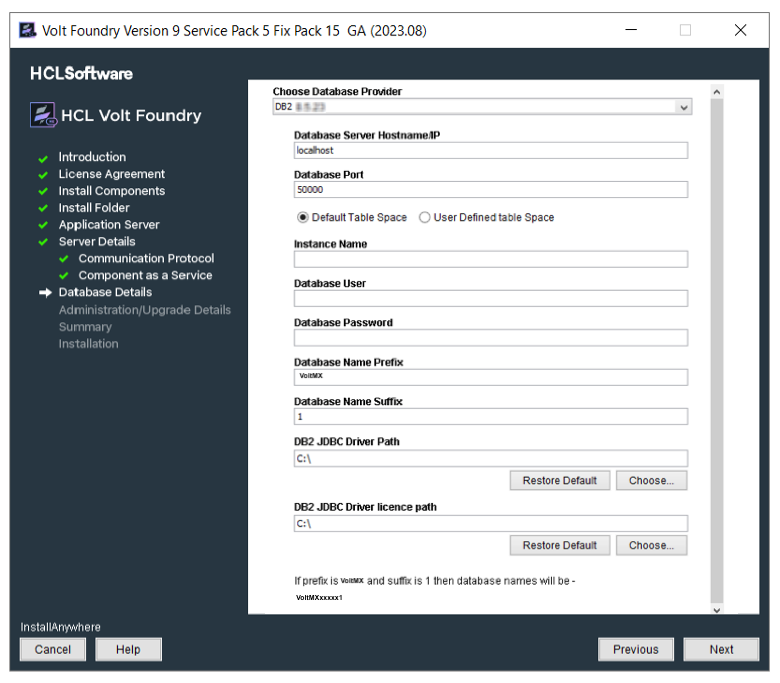 Database Name Prefix: Enter the valid prefix databases - for example, VoltMX.