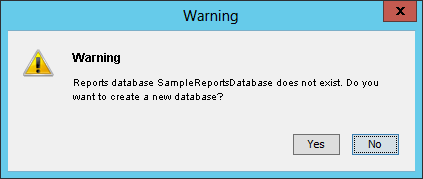 SampleReportsDatabase. If the reports database name does not exist, the system displays the warning message:Reports database SampleReportsDatabase does not exist. Do you want to create a new database?, shown below: