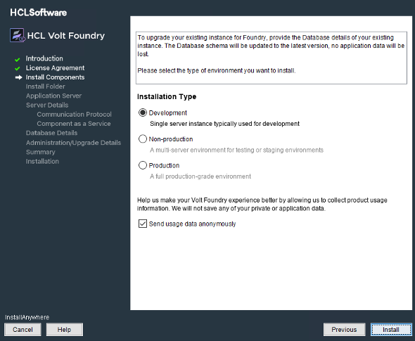 - Select the Send usage data anonymously check box. Allows VoltMX to collect product usage information to make your Volt Foundry experience better. VoltMX does not save any of your private or application data. By default this check box is selected.