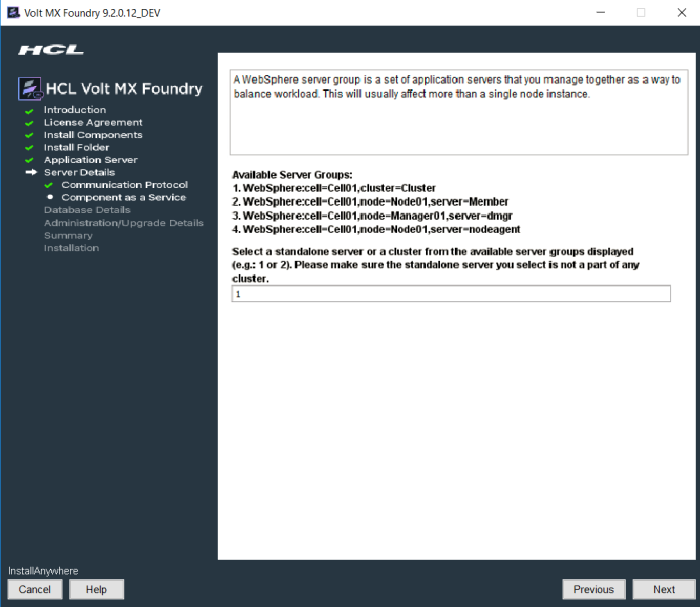 Enter server groups separated by commas - for example, 1, 2, shown in the previous step. Click Next. The system displays the selected groups in the Selected Server Group window, shown below: