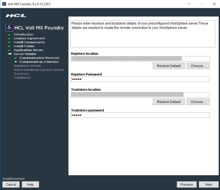 Click Next. The Keystore and Truststore details window appears. Enter the following details Keystore and Truststore details of your preconfigured WebSphere Server. These details are needed to create the remote connection to your WebSphere Server.