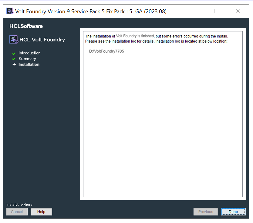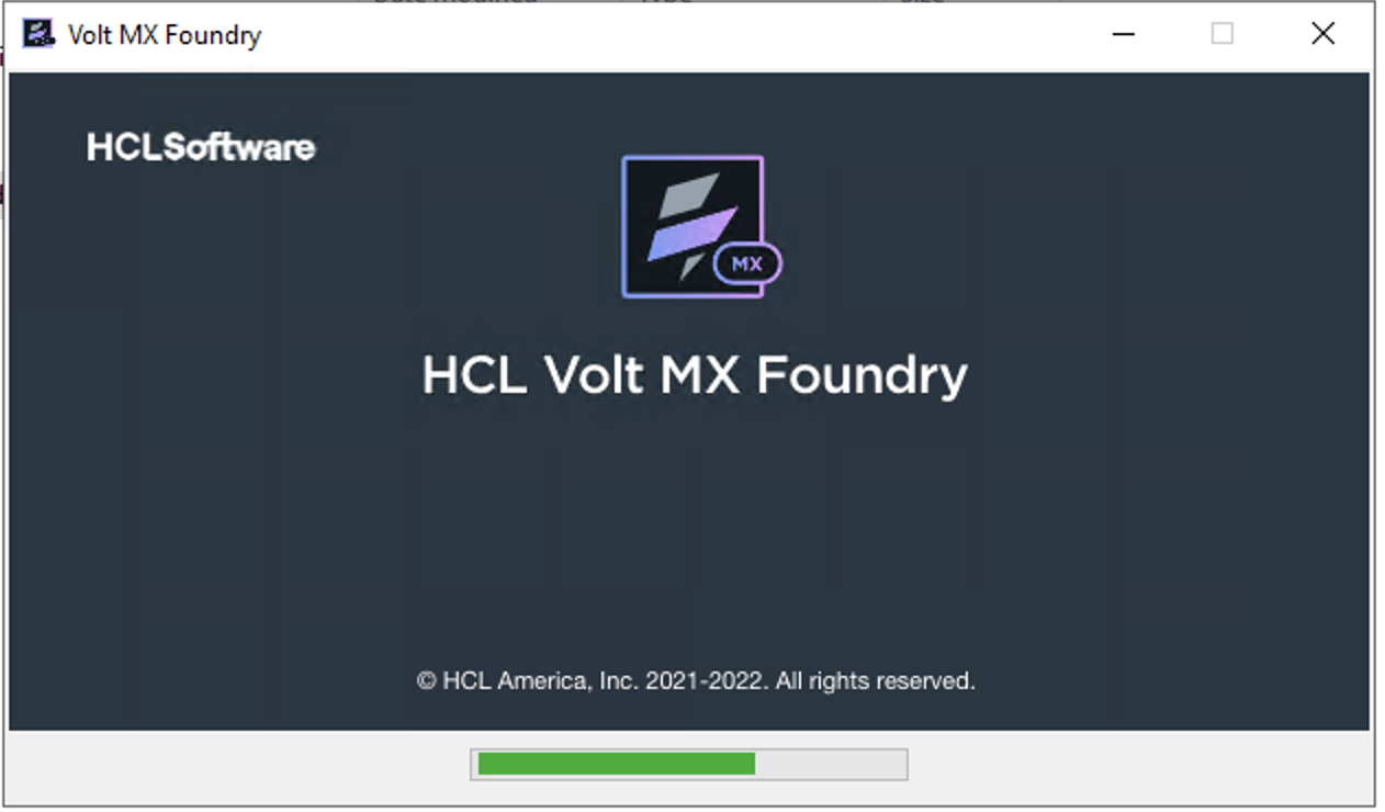 The installation of Volt Foundry is finished. In case of any errors during the installation, refer to the installation log for details. Installation log is located at below location: For example, C:\VoltMXFoundry900\