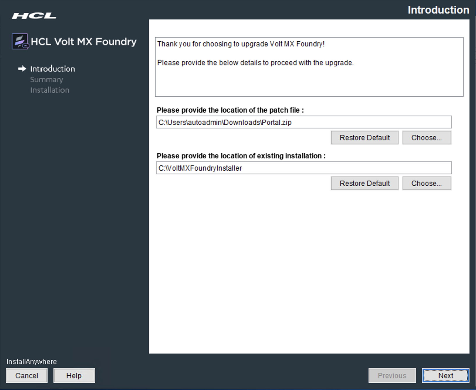 - Next, the Introduction window appears asking for following details: Enter the details to proceed with the upgrade: