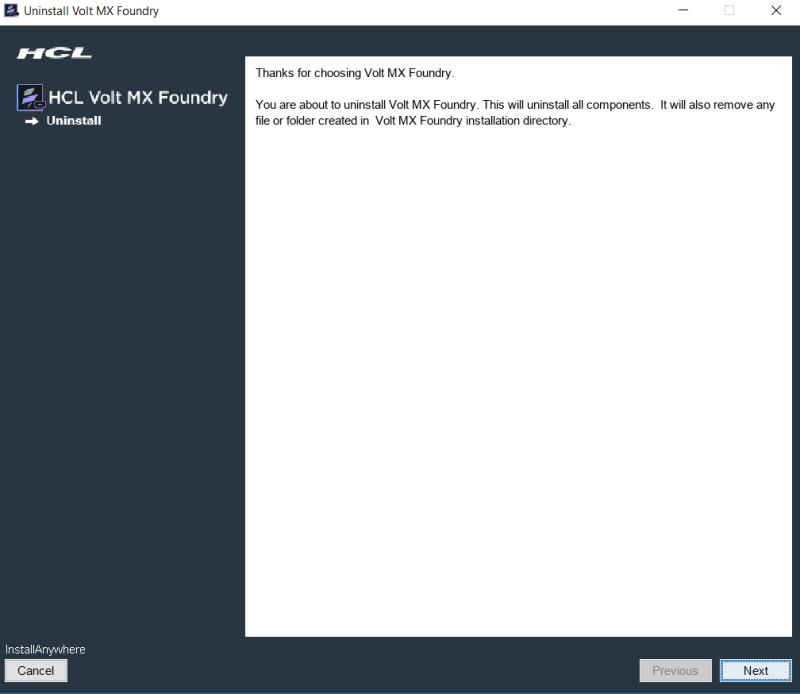The instructions given below explains how to uninstall Volt MX Foundry.