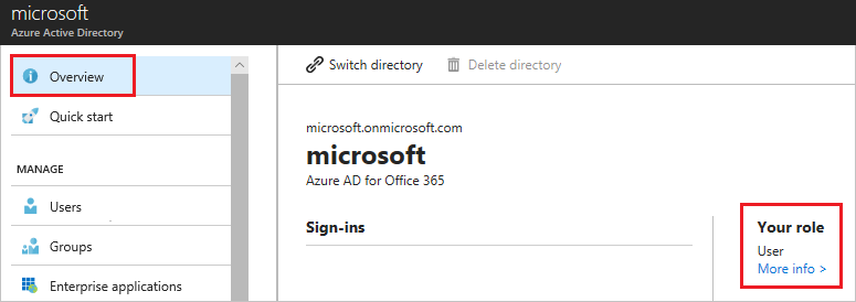 - In Azure Active Directory, select Overview and look at your user information. You should have the role of a Global Administrator to proceed further. If you do not have this role, contact your administrator to assign this role to you.