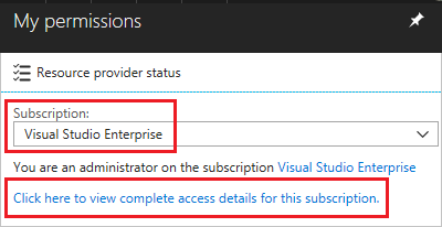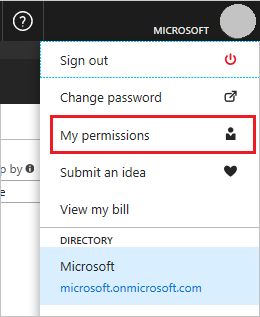 - In the Azure Portal, select your account from the upper right corner, and select My permissions.