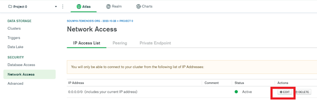 Create a cluster in your Atlas account and Allow access from anywhere in the IP access list which is present under Network Access. Then, create a database user for your cluster and connect it to your cluster. Refer to Get Started with Atlas for the exact procedure that needs to be followed to execute this step.