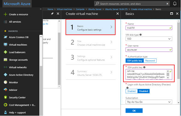 - Proceed with the remaining steps in the wizard and provide the SSH Public Key where needed.