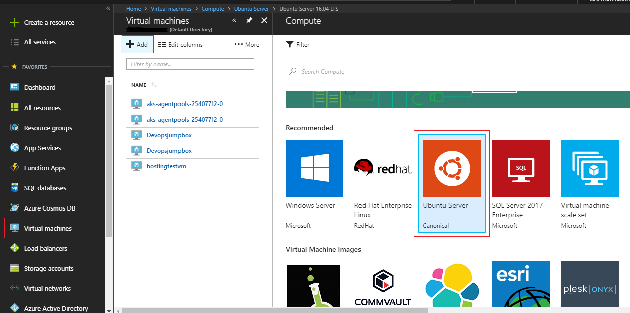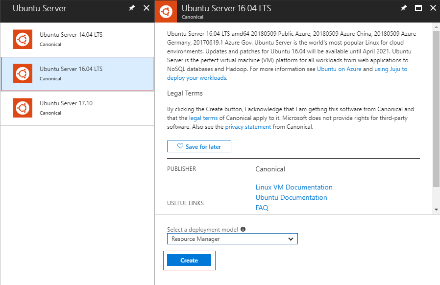 - Select Ubuntu Server 16.04 LTS image and click on Create.