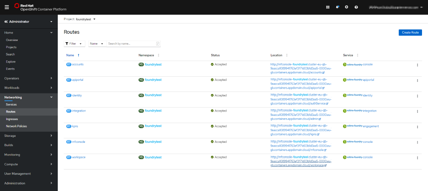 - The Foundry components for accounts, mfconsole, and workspace share the same deployment and service. Therefore, while creating the ingress objects for accounts, mfconsole, and workspace, the paths are mapped to the same service: voltmx-foundry-console.
