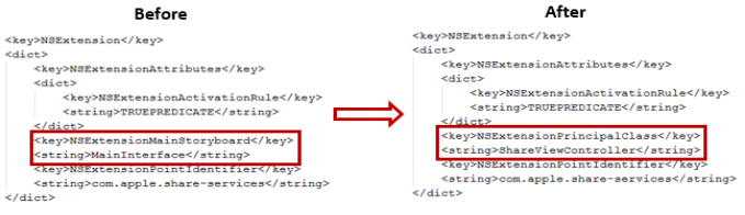 NSExtensionMainStoryboardkey withNSExtensionPrincipalClass, and also replace its value,MainInterfacewithShareViewController. The figure below shows difference in the Info.plist file before and after modification.