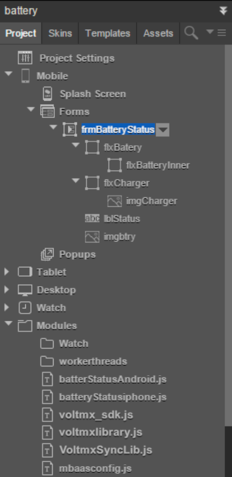 The project contains a single form which contains flex containers for the battery status graphic and the Charger status graphic. The top level form, frmBatteryStatus has an action associated with it's preShow event that makes the api calls to display the charging and battery status for the phone.