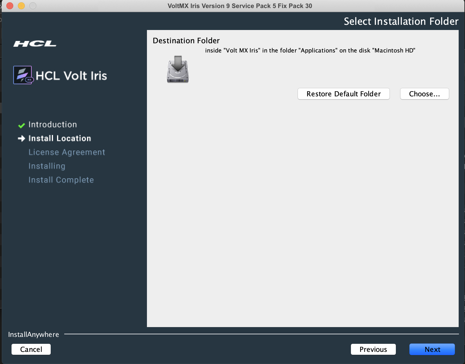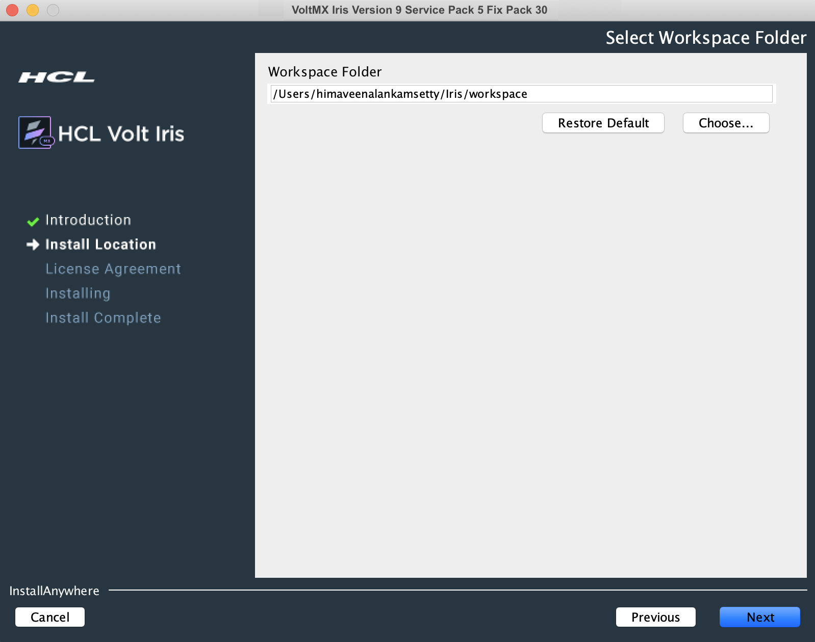 Click Restore Default Folder to reset the default installation folder.Note: The Workspace folder contains all your Volt MX Iris projects.