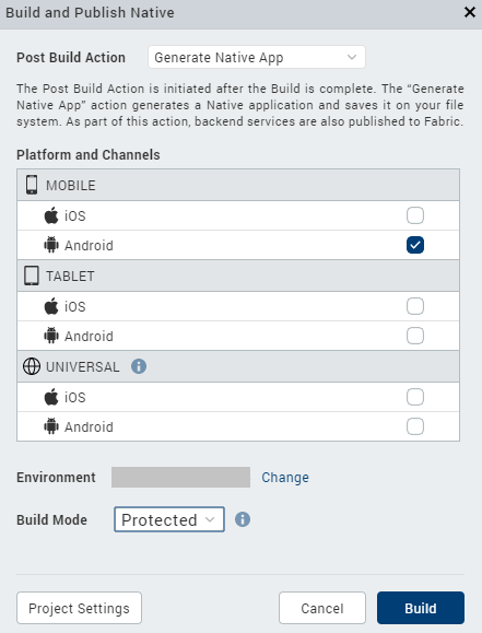 The Build and Publish Native dialog box appears. - Select the required channels and platforms.