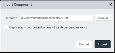 Click Browse to navigate to the location of the component, select the component, and then click Import. The component and its associated widgets and modules are added to your project.