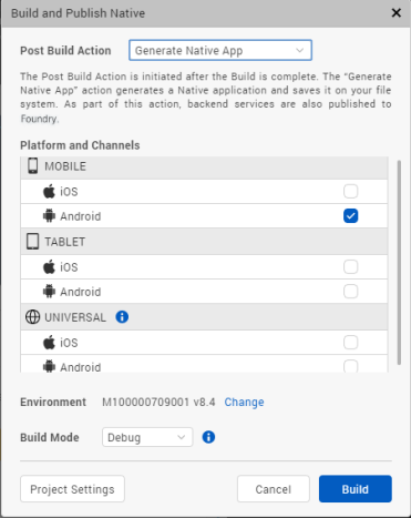 You can generate native apps even for the Universal channel using option. This option will generate the APK or IPA for each of the platforms and channels selected.