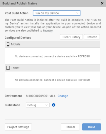 - Build and Publish Native - Builds the application for the selected native platforms and performs the selected Post Build Action. There are three types of Post Build Actions: