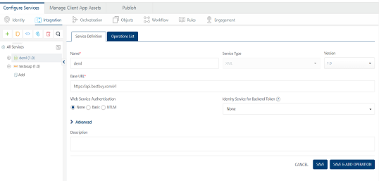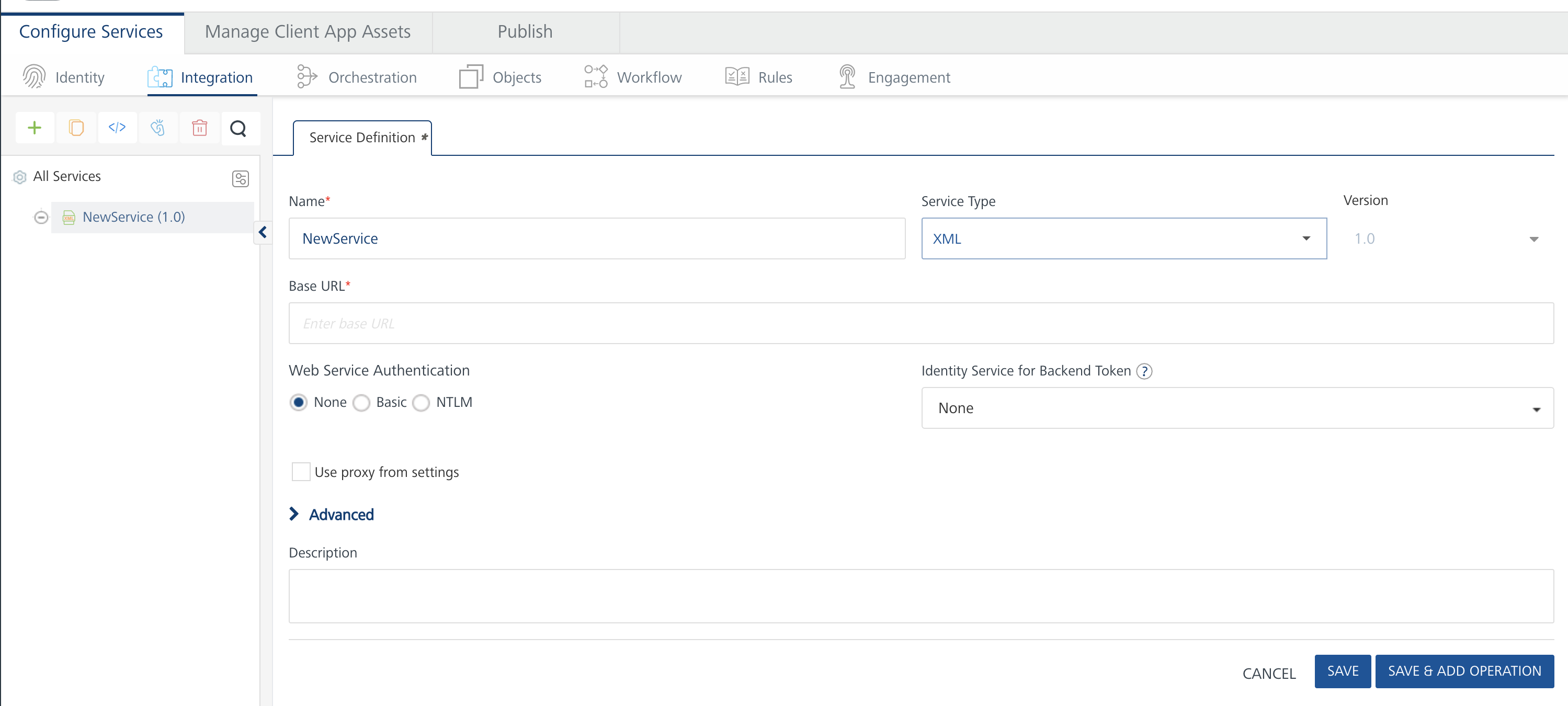 To create a new integration service, on the Integration tab, click CONFIGURE NEW. The Service Definition section appears.