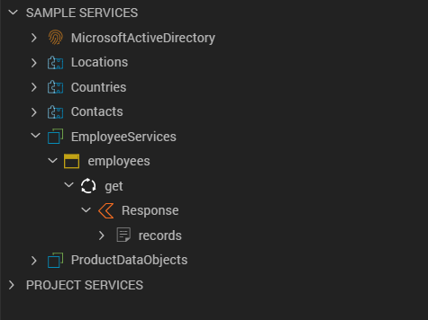 4. Expand any Object service. Here, EmployeeDataObjects and ProductDataObjects are the sample Object services. 5. Expand any Object service to view its available Request parameter. The respective responseList or requestList is auto-displayed. Here, Employee Services > employees > get > Response > records.