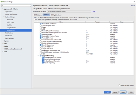- Navigate to File > Settings > Appearance & Behavior > System Settings > Android SDK. The Android SDK settings window appears with the SDK Platforms tab open by default.