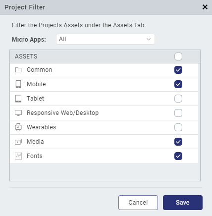 - From the Assets section, select the filters that you want to apply for the micro apps.