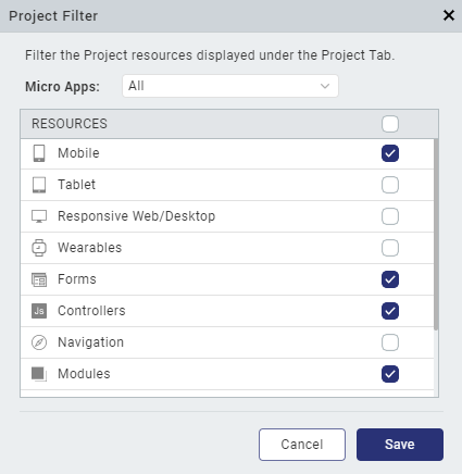 - From the Resources section, select the filters that you want to apply for the micro apps.