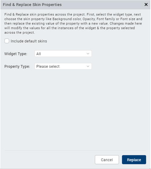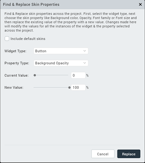 - Dependent or Platform-specific Skin properties cannot be changed using the Find and Replace option.