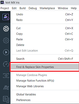 In the V9 Service Pack 2 release, Volt MX Iris has introduced a new feature to rebrand apps, the Find and Replace Skin Properties option. This feature enables developers to customize the skin properties present in a current theme of the project.