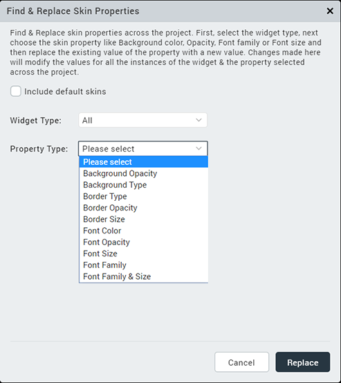 Using the Find and Replace Skin Properties option, you can customize the Background, Border, and Font properties of the skins available in a theme across the project. The changes made in the Find and Replace interface will modify the values for all the instances of the property pertaining to the widget.